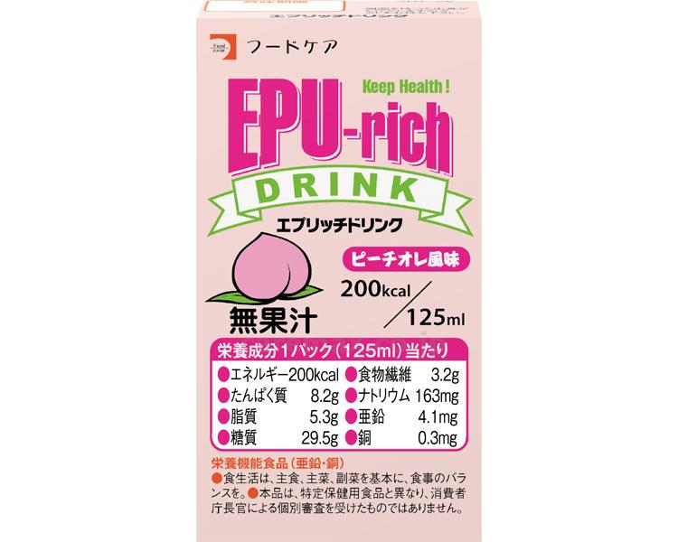 出荷単位:24大型商品の場合、追加で送料が発生する場合がございます。メーカー直送品です【JANコード】4528457088045・毎日の栄養摂取をおいしくサポートするエプリッチドリンク。・本品は多量摂取により疾病が治癒したり、より健康が増進するものではありません。1日の摂取目安量を守ってください。・亜鉛の摂りすぎは、銅の吸収を阻害するおそれがありますので、過剰摂取にならないよう注意してください。・乳幼児、小児は本品の摂取を避けてください。・本品は特定保健用食品とは異なり、消費者庁長官による個別審査を受けたものではありません。・食生活は、主食、主菜、副菜を基本に、食事のバランスを。 ●原材料/デキストリン、砂糖、植物油脂、難消化性デキストリン、大豆たん白、食塩、カゼインNa(乳由来)、香料、乳化剤、安定剤(セルロース、カラギナン)、pH調整剤、グルコン酸亜鉛、着色料(紅麹)、グルコン酸銅●栄養成分(1パック当たり)/エネルギー:200kcal、水分:93。5g、たんぱく質:8。2g、脂質:5。3g、糖質:29。5g、灰分:0。4g、ナトリウム:163mg、カリウム:6mg、カルシウム:8mg、マグネシウム:1mg、リン:80mg、鉄:0。2mg、亜鉛:4。1mg、銅:0。3mg、ビタミンE:0。3mg、ビタミンB2:0。04mg、ナイアシン:1。6mgNE、ビタミンB6:0。01mg、食物繊維:3。2g、食塩相当量:0。4g●賞味期限/製造より8ヶ月●アレルギー/乳・大豆