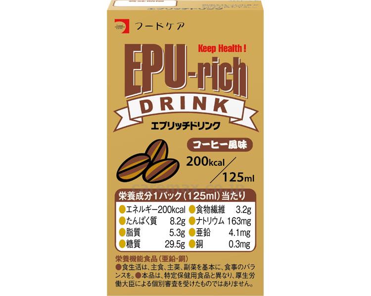 出荷単位:24大型商品の場合、追加で送料が発生する場合がございます。メーカー直送品です【JANコード】4528457088021・毎日の栄養摂取をおいしくサポートするエプリッチドリンク。・本品は多量摂取により疾病が治癒したり、より健康が増進するものではありません。1日の摂取目安量を守ってください。・亜鉛の摂りすぎは、銅の吸収を阻害するおそれがありますので、過剰摂取にならないよう注意してください。・乳幼児、小児は本品の摂取を避けてください。・本品は特定保健用食品とは異なり、消費者庁長官による個別審査を受けたものではありません。・食生活は、主食、主菜、副菜を基本に、食事のバランスを。 ●原材料/デキストリン、砂糖、植物油脂、難消化性デキストリン、大豆たん白、食塩、カゼインNa(乳由来)、香料、乳化剤、安定剤(セルロース、カラギナン)、着色料(カラメル)、pH調整剤、グルコン酸亜鉛、グルコン酸銅●栄養成分(1パック当たり)/エネルギー:200kcal、水分:93。5g、たんぱく質:8。2g、脂質:5。3g、糖質:29。5g、灰分:0。4g、ナトリウム:163mg、カリウム:6mg、カルシウム:8mg、マグネシウム:1mg、リン:80mg、鉄:0。2mg、亜鉛:4。1mg、銅:0。3mg、ビタミンE:0。3mg、ビタミンB2:0。04mg、ナイアシン:1。6mgNE、ビタミンB6:0。01mg、食物繊維:3。2g、食塩相当量:0。4g●賞味期限/製造より8ヶ月●アレルギー/乳・大豆