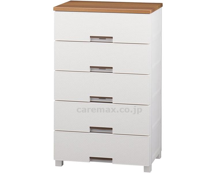 ●サイズ/最大外寸:約幅65×奥行41×高さ105cm、有効内寸:約幅57×奥行34.5×高さ15cm(×5段)●重さ/約14.9kg●材質/本体・引出し・ロック・ローラー:ポリプロピレン、脚:ポリプロピレン・ポリエチレン(すべり止め)、前パネル:スチロール樹脂、天板:MDF化粧板●収納の目安(各引き出し)/トレーナー:約10枚、セーター:約6枚、Yシャツ:約8枚●耐荷重/天板:約10kg、引出し:約5kg●付属品/すべり止め付専用脚×4●生産国/日本